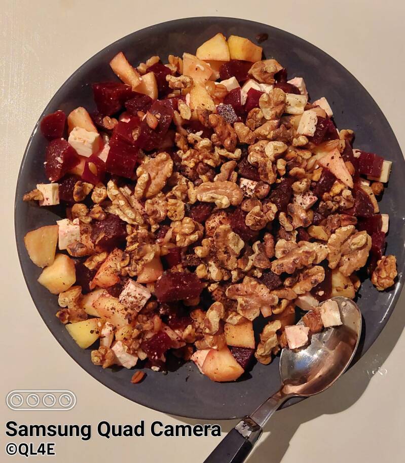 1 appel, stuk fetakaas, handje restant walnoten, 2 eetlepels spelt en 4 kleine gekookte bietjes
