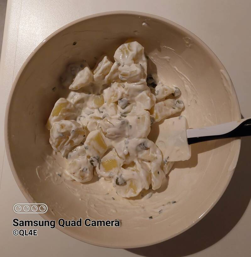 5 aardappels, handje augurken, bieslook, half bakje crèmefraiche, 1 el. mayonaise, zout en peper