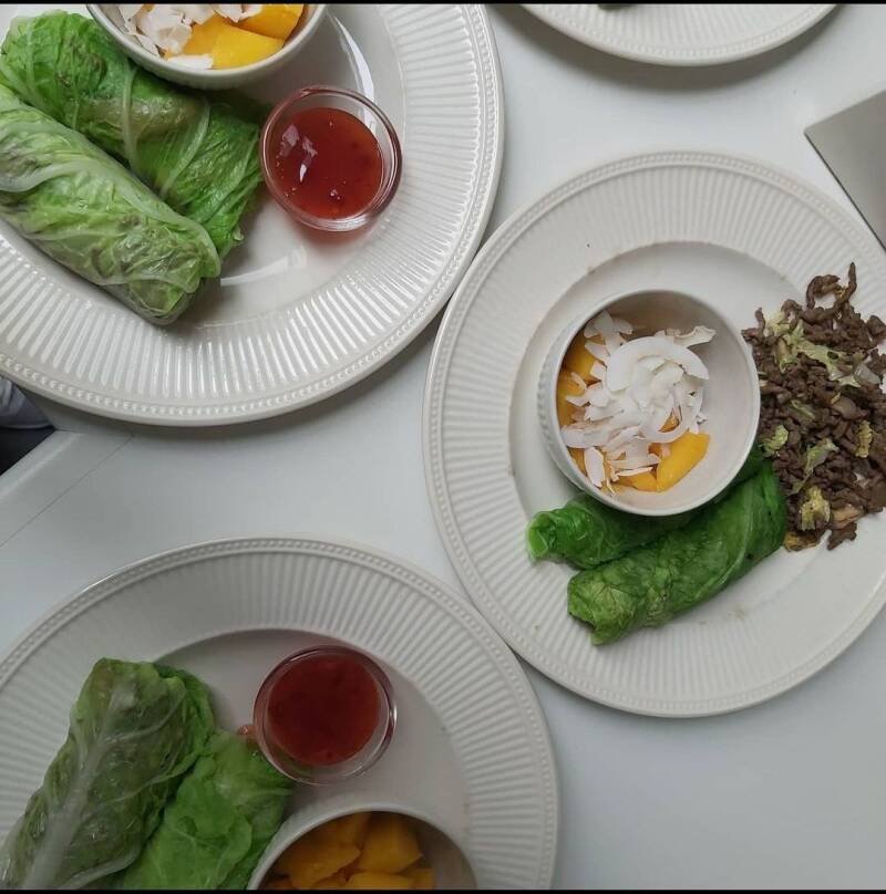 Chinese kool wraps gevuld met gehakt (vandaag geen vega gehakt), oesterzwam (Fodmap groen) en gewokte groene deel van de kool (Fodmap rood kan ik deels verdragen). Daarbij: Mango (Fodmap rood) met een scheutje olijfolie en voor de extra vezels bestrooid met wat kokossnippers. En als dip een kommetje chilisaus.