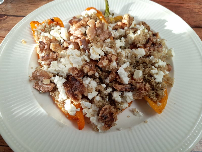 Een gevulde paprika met als topping Feta ( of mozzarella of geitenkaas) en walnoten. Deze even onder de gril en bij het opdienen nog wat honing erover.