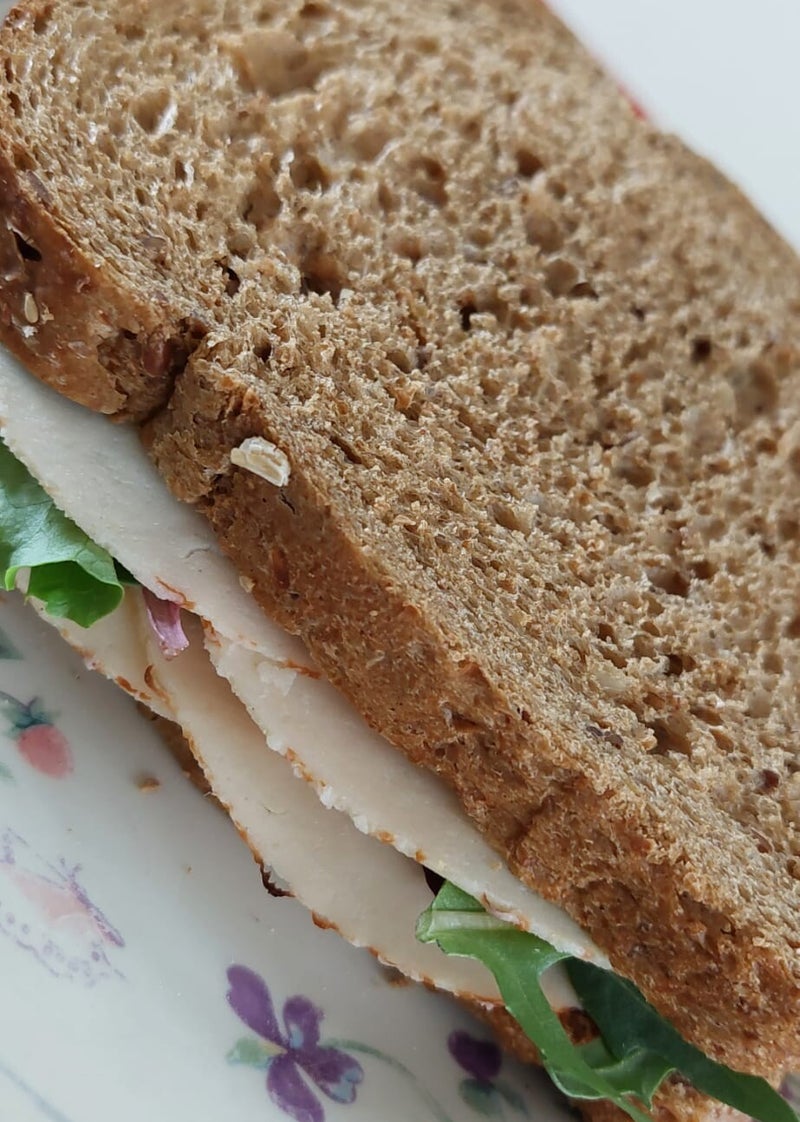 Een klein kontje komkommer en een handje met sla. Nou toen dacht ik ik heb eigenlijk wel zin in meer eiwitten. “PING” Dus toen heb ik mosterd op een heel donker brood gedaan, het is lekkerder vers groot brood koopt of zelf bakt dat zou nog beter zijn! Dan dikke plakken snijden en een mooie laag mosterd erop met 2-3 plakken kipfilet, wat sla en met een kaasschaaf komkommer in dunne plakken hier weer 2-3 kipfilet en de sandwich afgemaakt met een snee brood ( niet vergeten met mosterd ) op en voila ! Om er een warme maaltijd van te maken kun je het eten bij zelfgemaakte kippensoep of een pannetje tomatensoep wat ook zo easy is. En als het echt echt niet kan, is een mok bouillon erbij ook prima. Zo had ik een warme lunch :-).